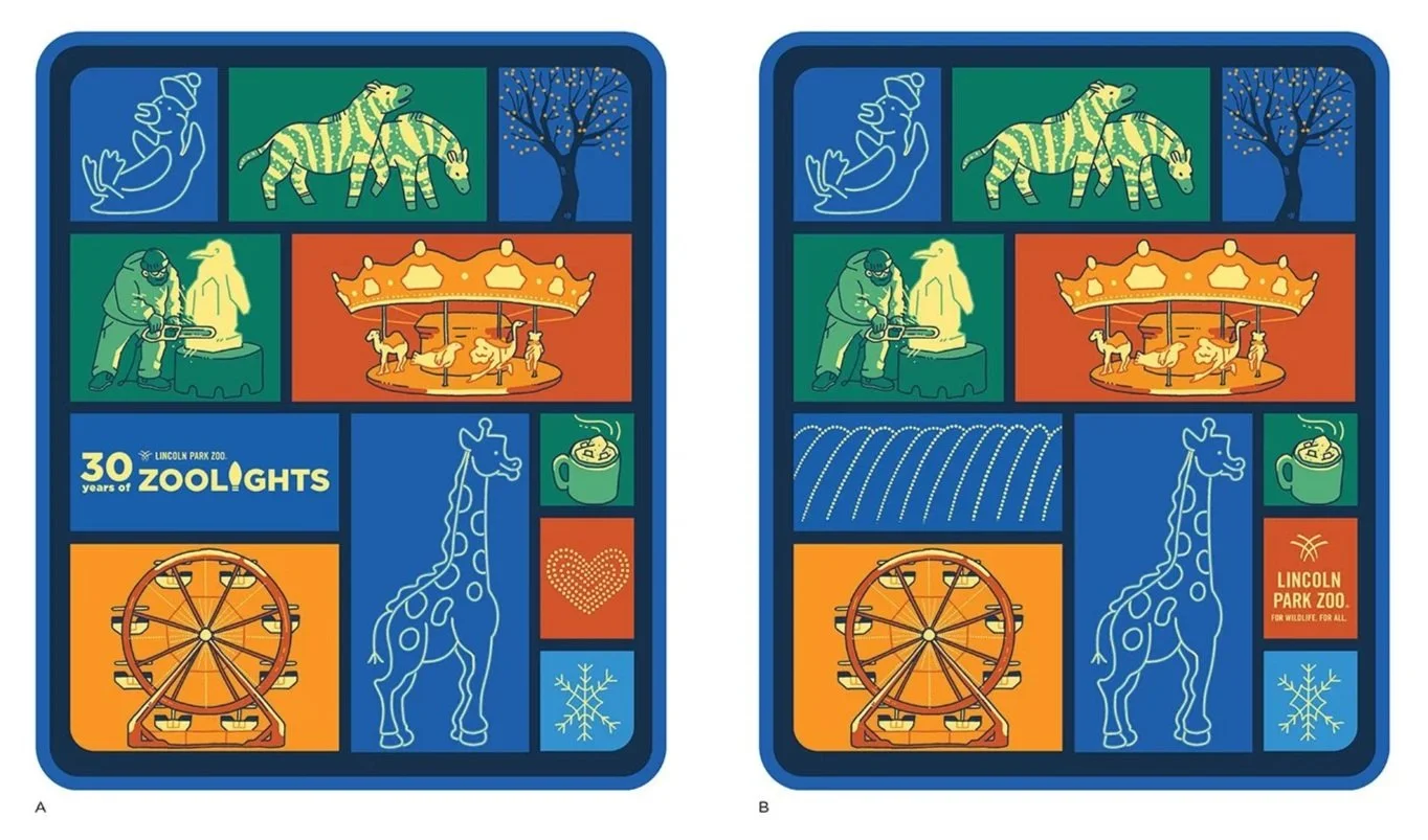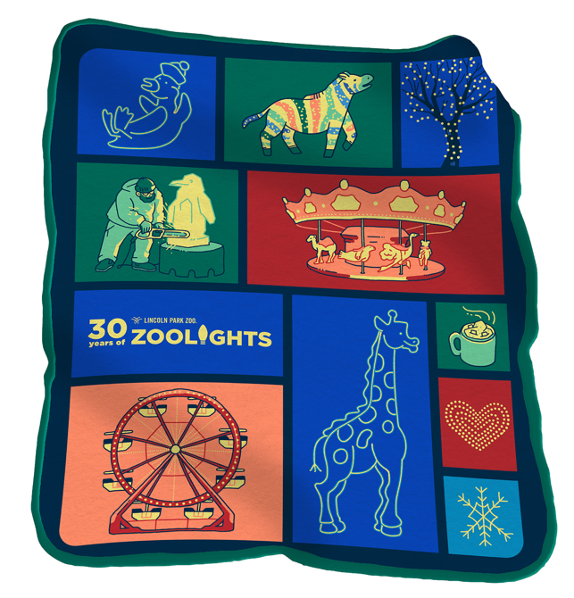 I provided the illustrations and design for this custom blanket to commemorate the 30th anniversary of Lincoln Park Zoo’s annual holiday light show.